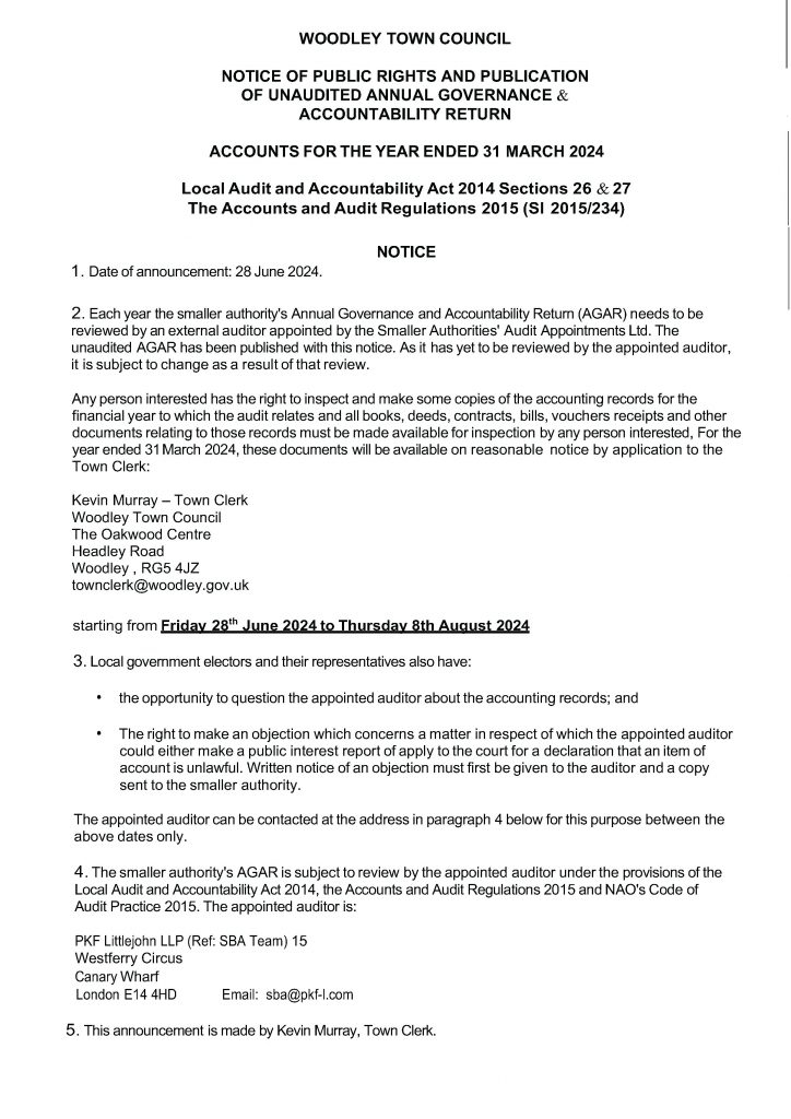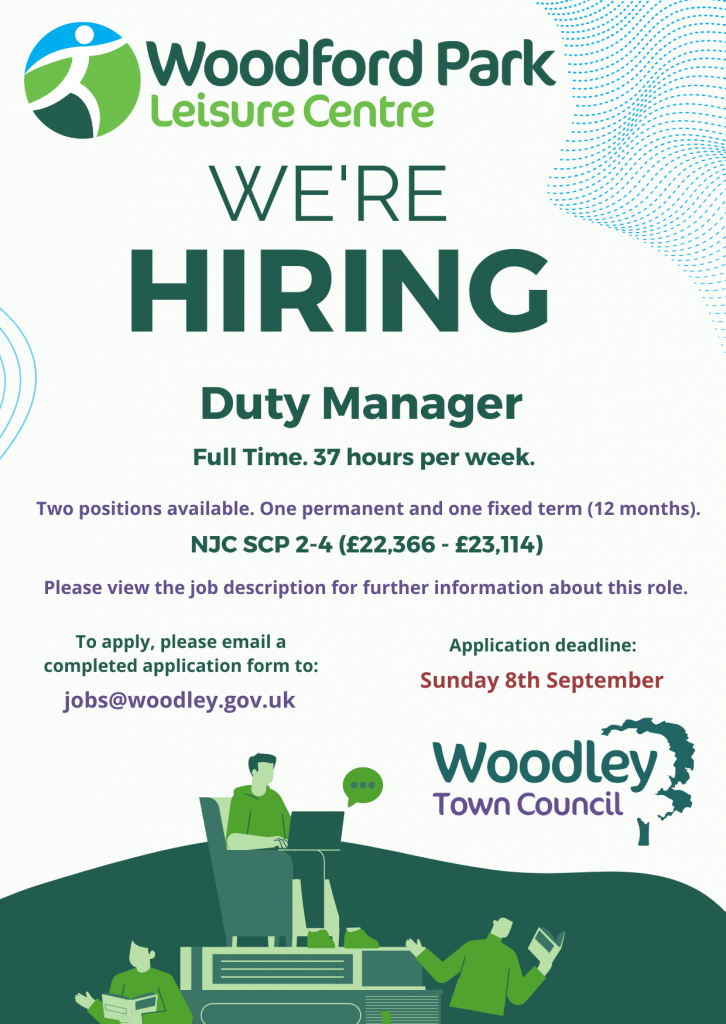 Notice of a meeting of Woodley Town Council's Leisure Services Committee, taking place on Tuesday 3rd September 2024 at 8:00pm at the Oakwood Centre in Woodley