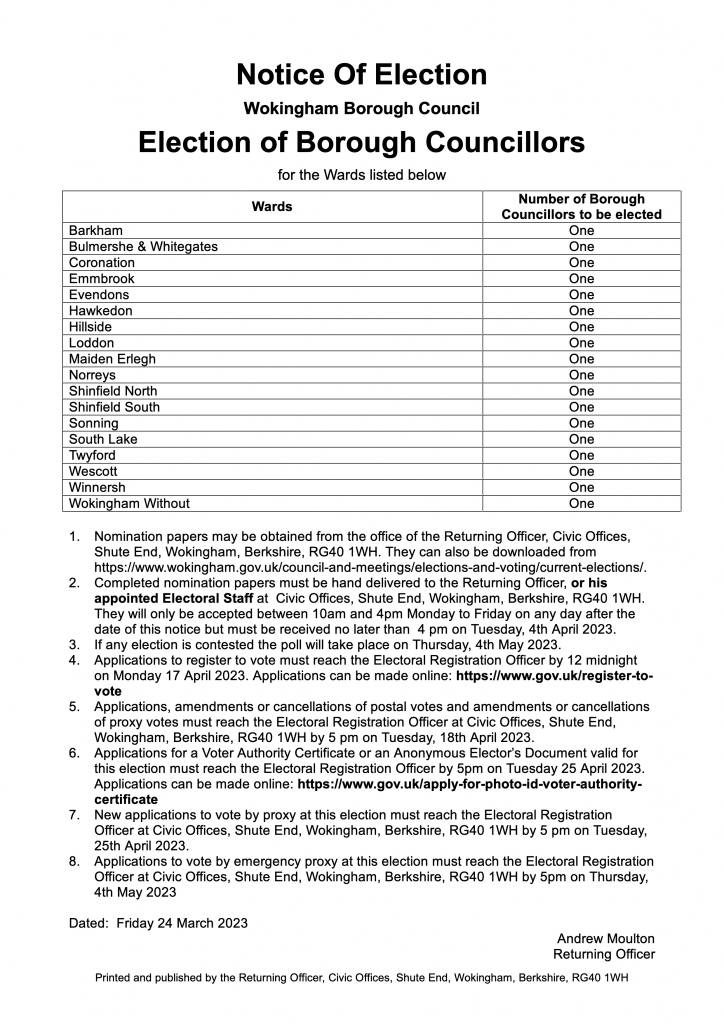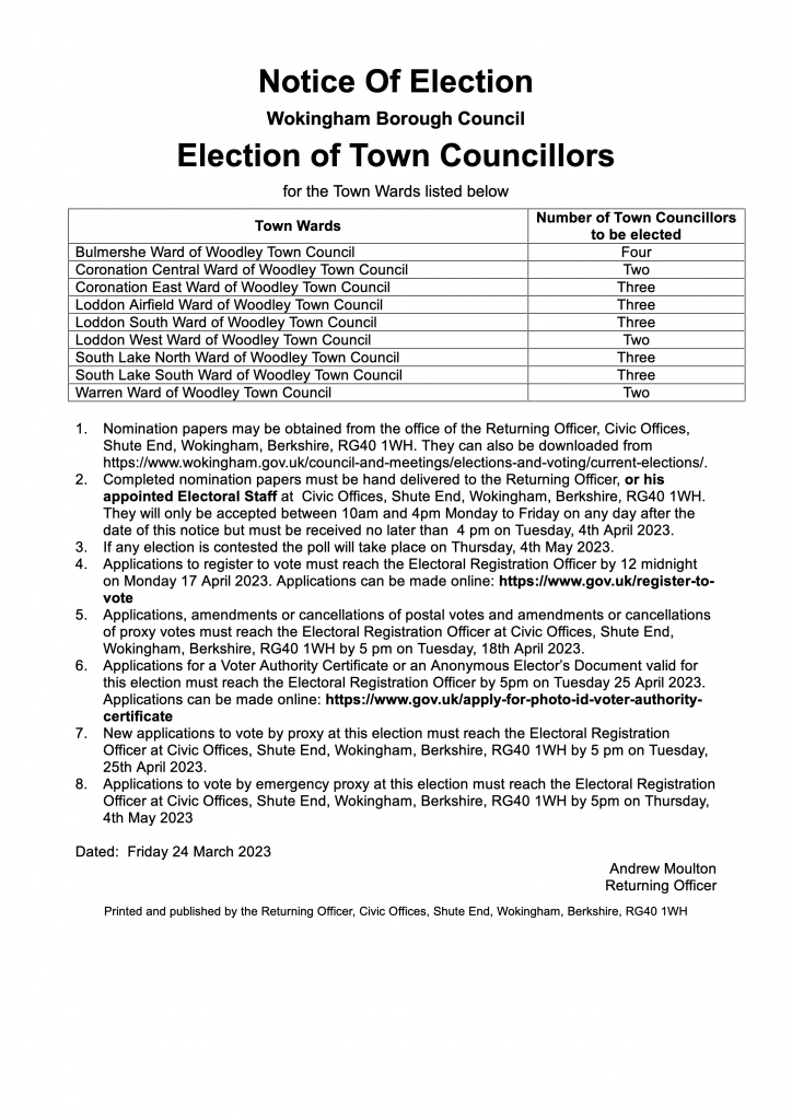 Download the Declaration of Result of Poll for Woodley Town Councillors HERE.