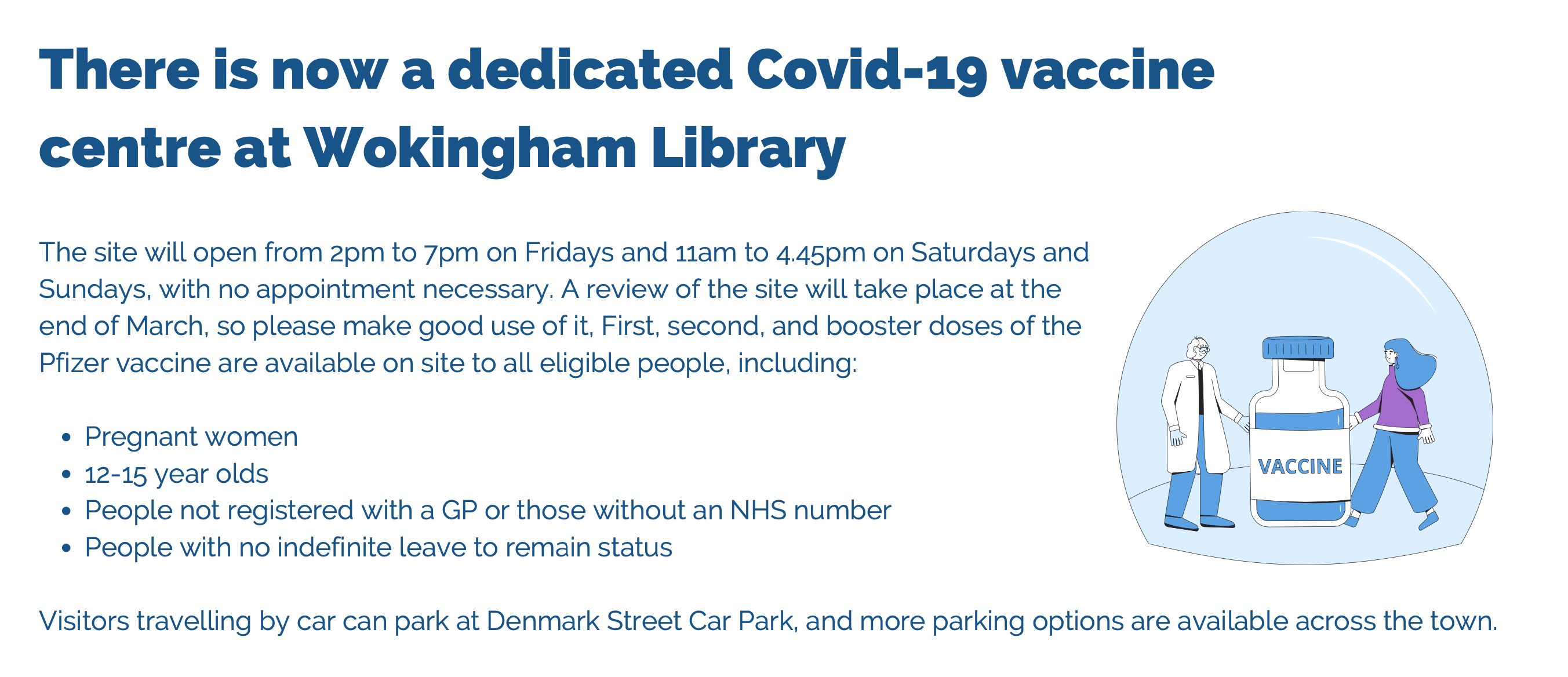 One of the main barriers has been the lack of a dedicated local vaccine centre, however, after many months of Wokingham Borough Council lobbying the NHS, a new walk-in vaccine centre has opened at Wokingham Library on Fridays (2pm to 7pm) and Saturdays and Sundays (11am to 4.45pm).