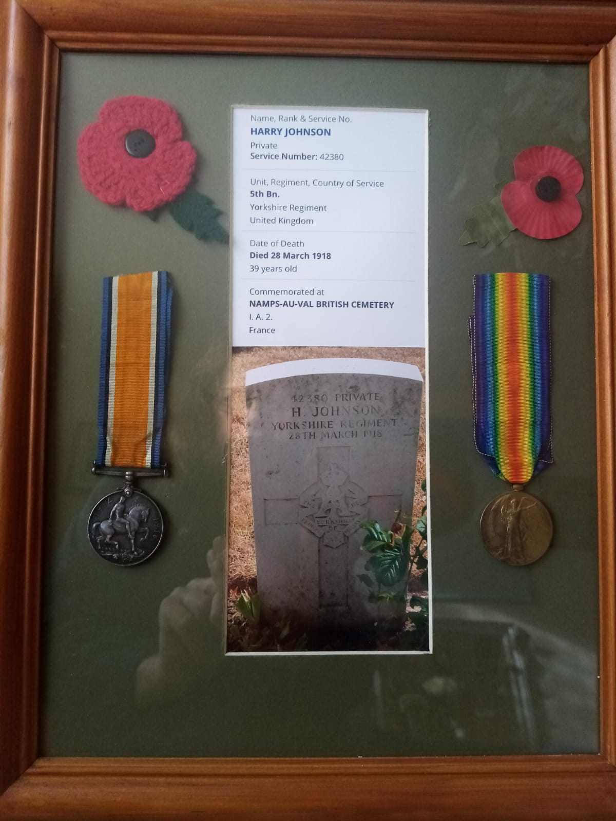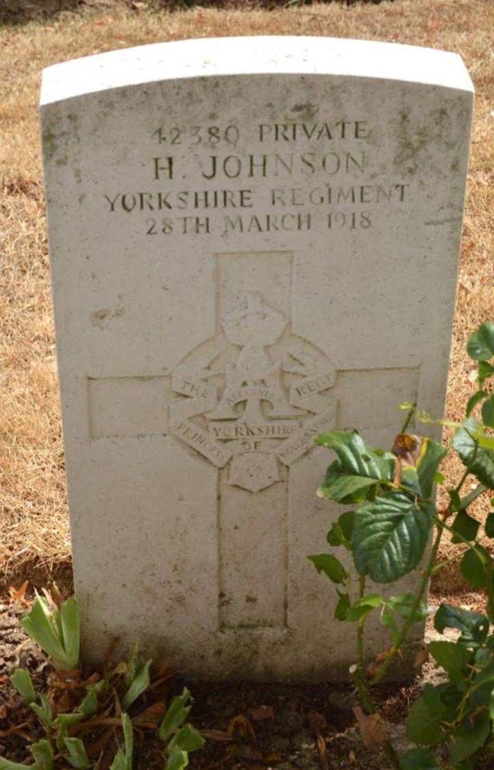 Private Harry Johnson (42380), 5th Battalion the Yorkshire Regiment, formerly 183578 RFA. Husband of Ellen Johnson of Field House, Woodley. Killed 28 March 1918, aged 39.