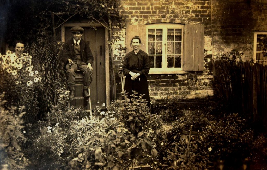 Illustration 2. Headley Cottages. Circa early 1920s with Horace Evans sitting on the ladder, and presumably his mother Emily Matilda. Horace was born on 23rd July 1899, fortunately just three months after the wedding in April. There then followed another son named Hubert.