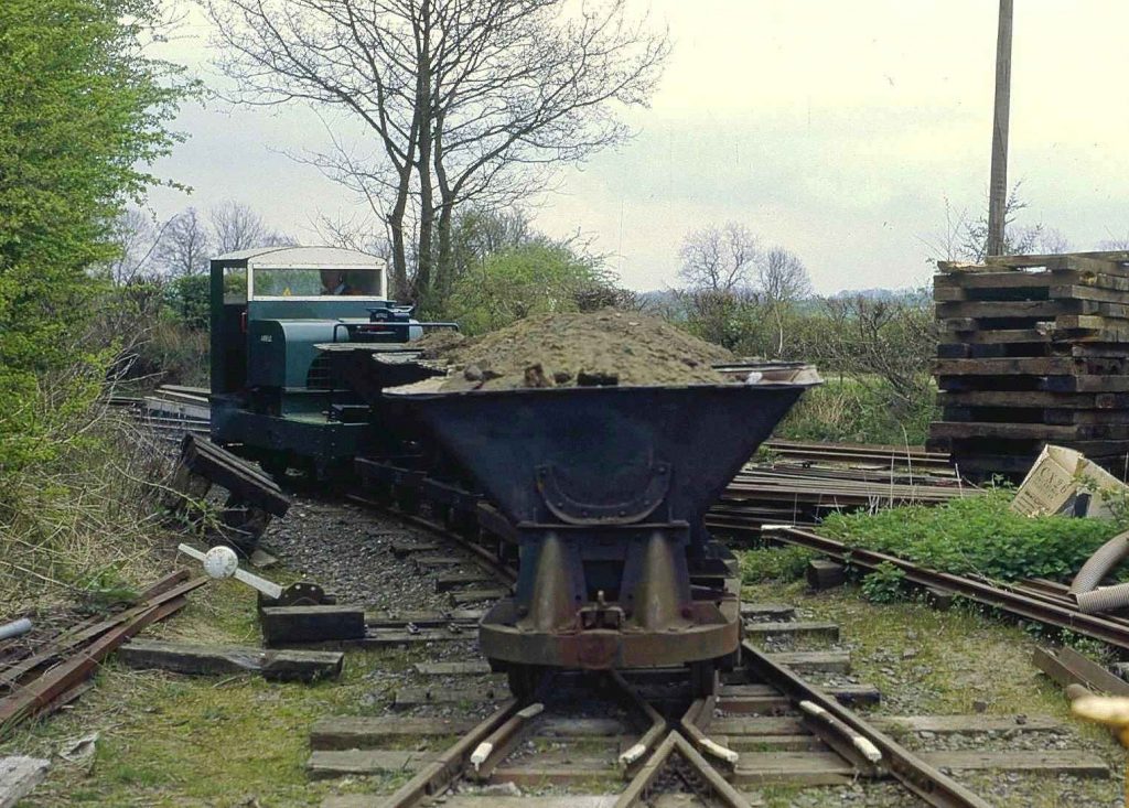 Illustration 14. Whilst not a scene from the post war era of gravel abstraction at Woodley, the diminutive locomotive with the driver sitting sideways and the side tipping hopper wagon pictured, are fine examples of what the gravel pits such as Ham River used for transporting the aggregates.