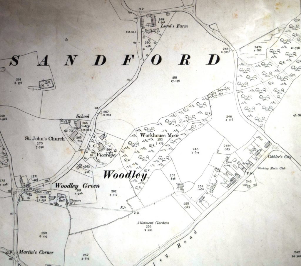 Illustration 1. Map of east Woodley with the village centred in and around the Bull and Chequers public house and St Johns Church etc. Clearly shown to the south of what was Workhouse Moor was Cobblers City, with Headley Cottages at the eastern extremity.