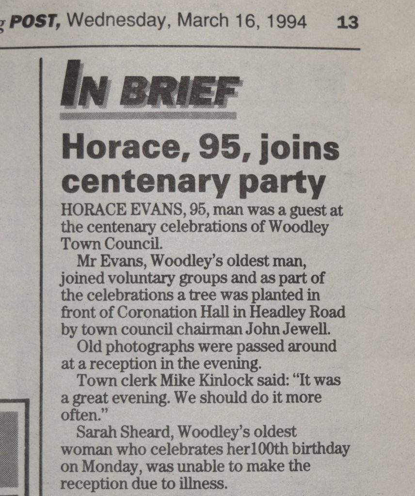 Illustration 7. Horace â The oldest man in Woodley. Reading Post. 16th March 1994.