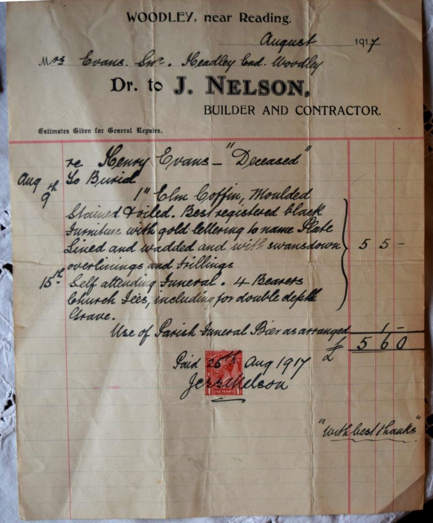 J. Nelson is listed in the local directory for 1916 as a builder and undertaker, which was an unusual pairing to say the least. Furthermore no address, both on the receipt and in the directory, is given other than Woodley. No doubt, so small was the local population to the postman and others that an address and house number was not considered to be of any worth.