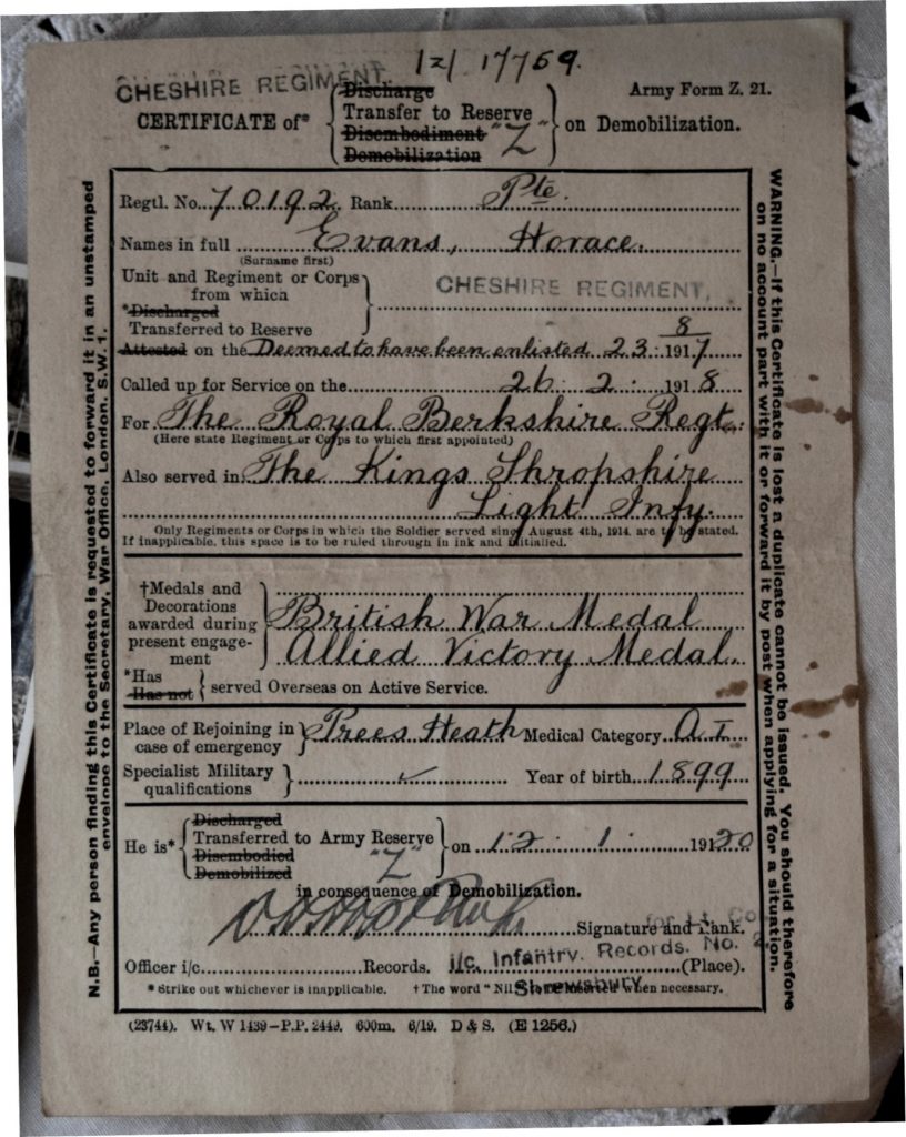 Illustration 6. By good fortune Horace Evans returned home in good health; having joined up as a mere seventeen year old lad in August 1917.