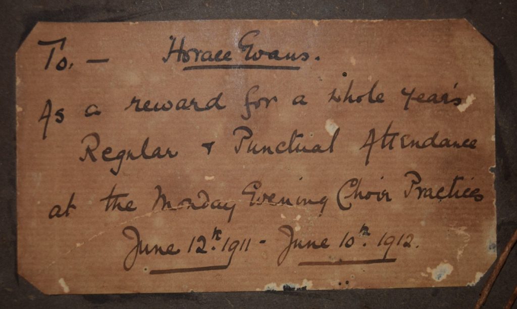Illustration 4. Â Horace appears to have been a lad of great diligence, as witnessed on the inside front page of a book presented to him at St. Johns Church in 1912, in recognition of a whole yearâs Regular & Punctual Attendance at the Monday evening Choir practice at St Johnâs Church, dated June 12th 1911 â June 10th 1912.