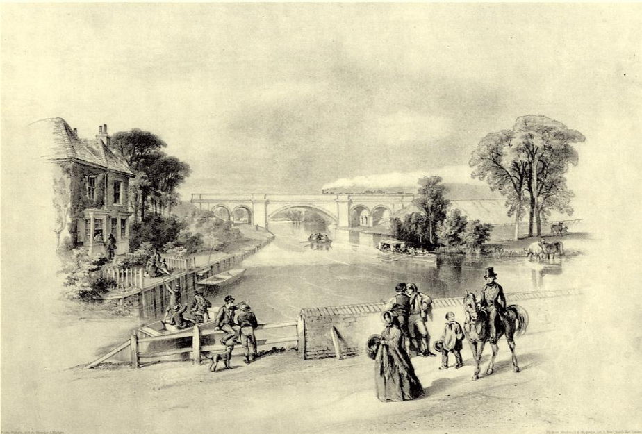 Reading and Reigate Railway in the 1840s with the George Inn and bridge over the River Loddon. Image courtesy of Reading Borough Libraries