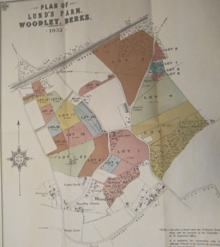 In 1932 Lundâs Farm, described as a half-timbered farm house, and 2 cottages were auctioned. Two cottages at Norris Green were let to Mr Tyler and Mrs Deadman. A part of the farmhouse was let to Mrs Page for 6s a week. It had well water. This was common in Woodley until after World War Two. The farm sale included 7 building plots on Church Road and more plots on Butts Hill Road. There was also Norris Copse and Workhouse Moor on Headley Road. Lundâs Farm was at the end of Church Road and Duffield Road.