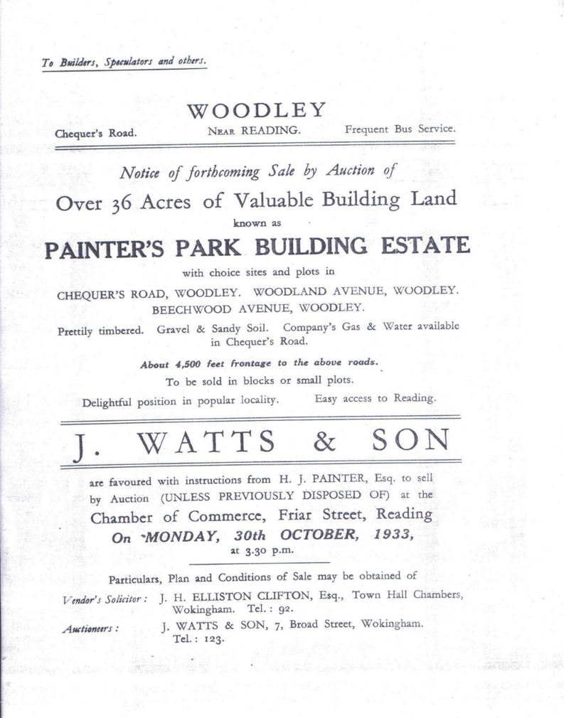 1933 Sale Catalogue for Painterâs Park building estate, Chequers Rd, (this was the northern part of Crockhamwell Rd near the pub), Woodland and Beechwood Avenues. The land was sold by Mr Harry Painter who owned the Colemanâs Moor gravel pits in the 1930s.