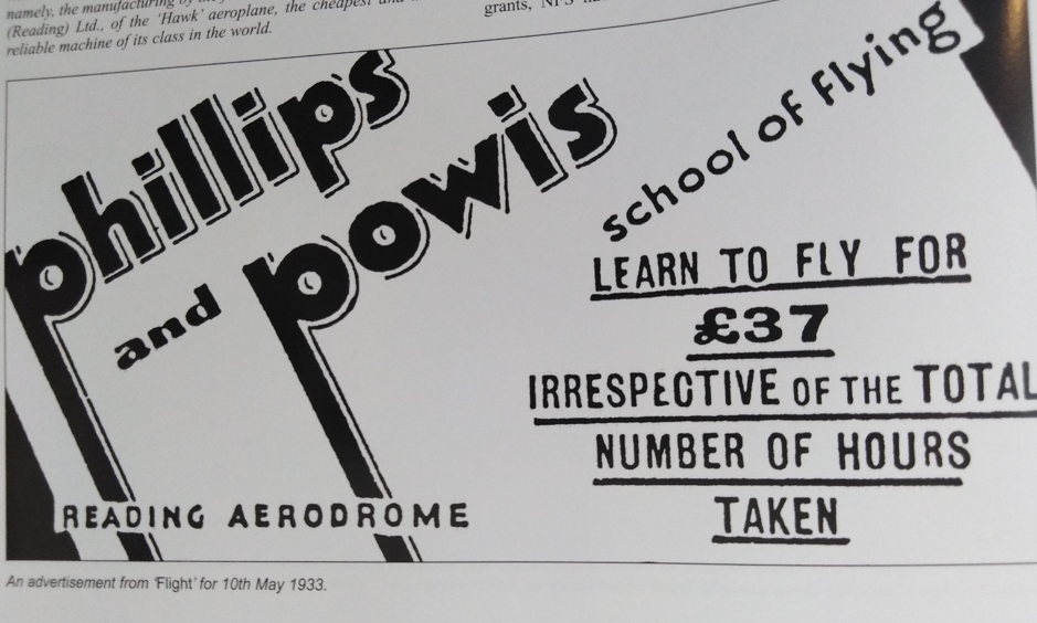 The second important event in the 20th century history of Woodley was the sale in 1929 of a 100 acre field to two Reading motor engineers Jack Phillips and Charles Powis, who started an aircraft business. They set up the Phillips and Powis School of Flying which charged 12s 6d for flying lessons. They used second hand aircraft but did not manufacture them.