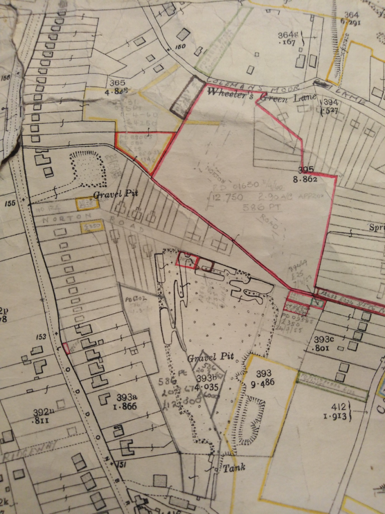 Richard Smith remembers that Colemans Moor Lane was formerly known as Wheelers Green Lane. The Post Office directory 1933 named it Wheelers Green Lane, then in 1934 it was Colemans Moor Lane. But Kelly’s directory 1932 had it as Colemans Moor Road, thus causing confusion to local postmen. It was shown on the 1933 Ordnance Survey map below as Wheelers Green Lane.