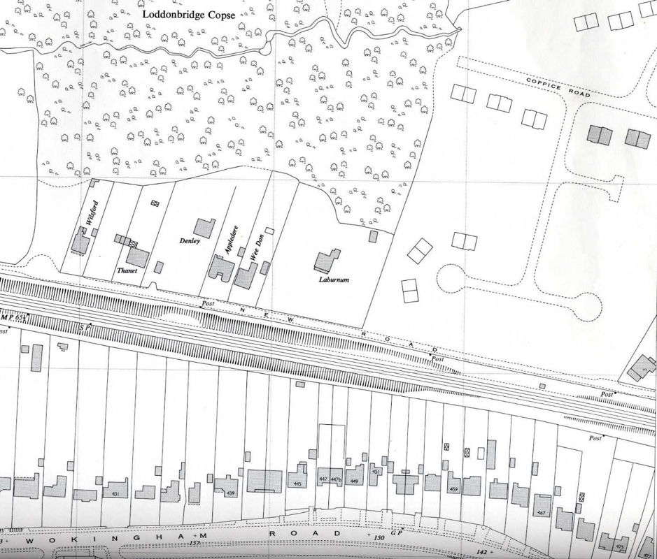 Pitts Lane houses were built during the 20th century, but the line of the road is older. It forms the western edge of Woodley.