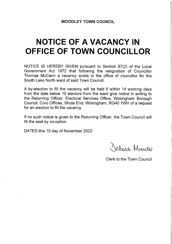 Notice of a vacancy in office of Town Councillor 15th November 2022