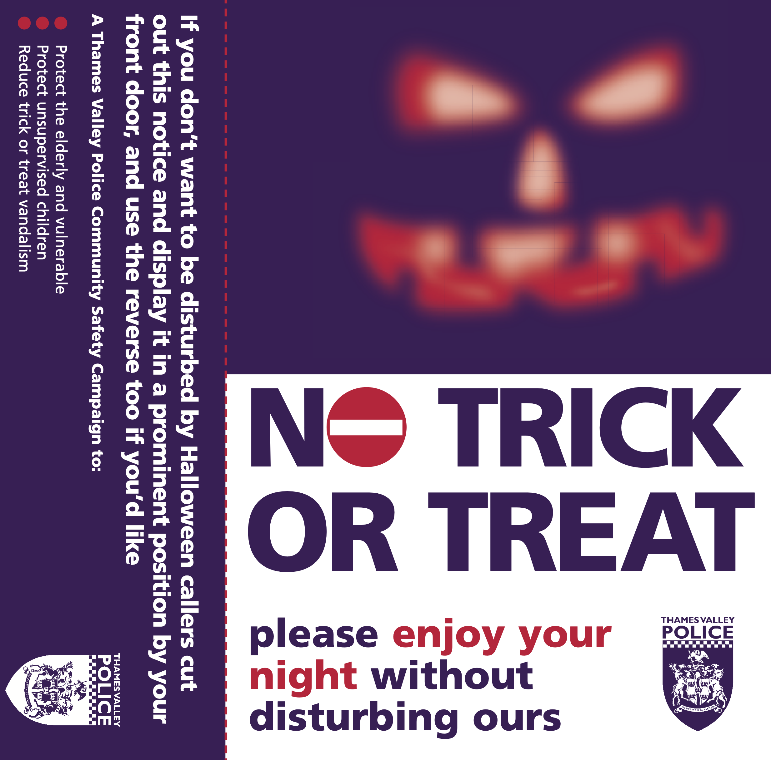 Thames Valley Police are keen to keep everyone safe this Halloween and Bonfire/Fireworks night and its Neighbourhood Team will be carrying out patrols in the evenings to make sure people who are trick or treating or enjoying the fireworks are doing so in a friendly manner and not causing a nuisance.
